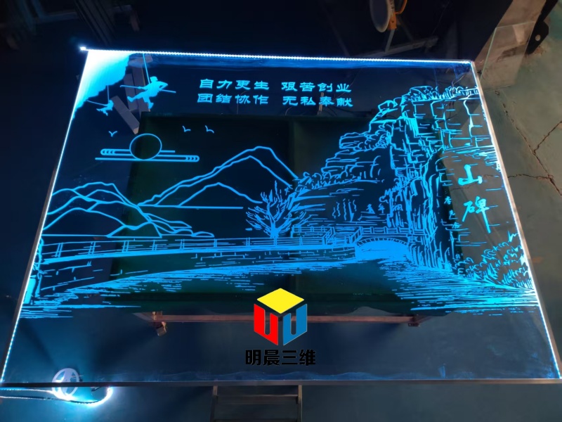 紅色文化展廳、歷史紀念館中,激光內雕玻璃可將革命故事、精神標語與標志性場景 “藏” 于玻璃內。光線透過時,歷史場景如電影般在玻璃中 “放映”,參觀者在光影變幻中沉浸式感受文化內涵,如圖中紅旗渠精神的展示,讓抽象的精神具象為可觸摸、可觀賞的藝術載體,實現文化傳播的 “可視化” 與 “體驗化”。